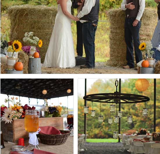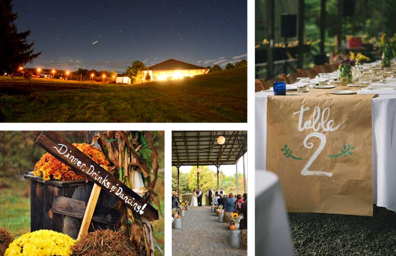 “Rose and Mark were a blast to work with. They made this wedding extra special by bringing sentimental family items, like a wagon-wheel chandelier and a bar made of reclaimed barn wood. They even made benches and an alter out of hay bales! I love helping folks make their weddings on my farm rustic, personal, and unique.” —Wally Nichols, Rustic Ridge View