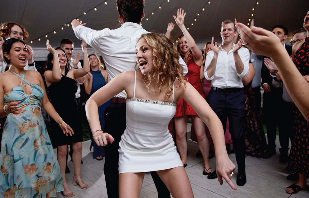 Wedding gowns can be gloriously dramatic creations with fabulous floods of lace and rich brocade that make you feel like genuine royalty. The drawback is—and has always been—that they require you to maintain a demure, placid demeanor that can get pretty wearing over an 8 to 10 hour stretch. Once the ceremony is done, you want to be able to table-hop, eat, drink, and dance with joy and abandon—and pounds of precisely fitted white satin and lace can become an annoyance.